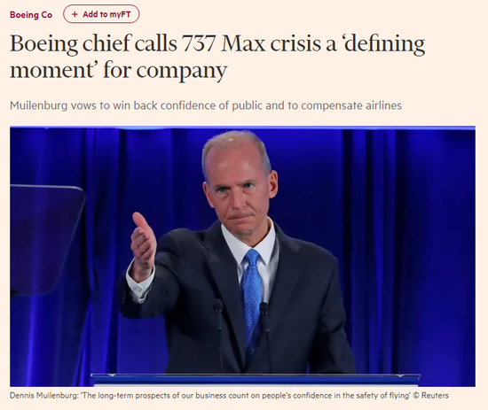 波音首席执行官丹尼斯-穆伦伯格(Dennis Muilenburg)表示,737 Max飞机的停飞事件动摇了公众对航空旅行安全的信心,对这家拥有103年历史的公司来说这是一个“决定性时刻”。