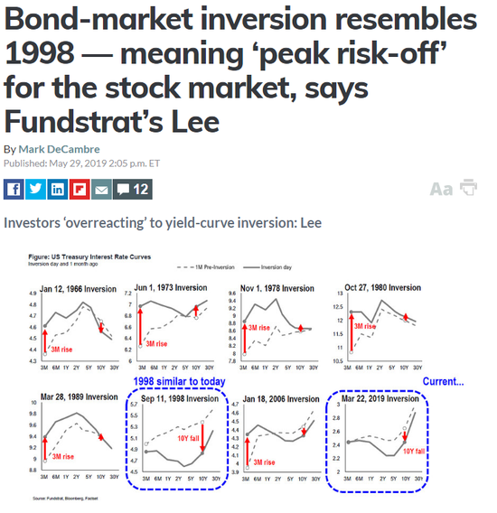 Fundstrat Global Advisors主管托马斯-李(Thomas Lee)表示,并非所有的反转都是一样的,并将当前的反转与1998年的情况进行了比较。他表示,当对10年期美国国债的需求推动利率走低,收益率曲线反转时,往往反映出对风险的担忧日益加剧,而不是预示着商业周期放缓。