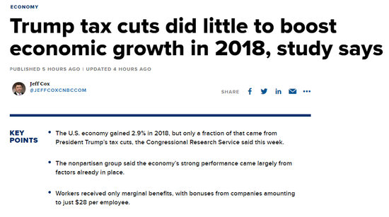 本周公布的一项研究显示,美国总统特朗普在过去一年实施的大规模减税措施并没有给2018年的强劲经济表现带来多少好处。