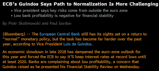 2018年末经济放缓抑制了欧元区今年的增长前景,迫使欧洲央行表示将维持利率在纪录低位至少持续至2020年。Guindos周三在发表《金融稳定评估》时提出了一个令人关切的问题:银行业在抱怨盈利能力弱。