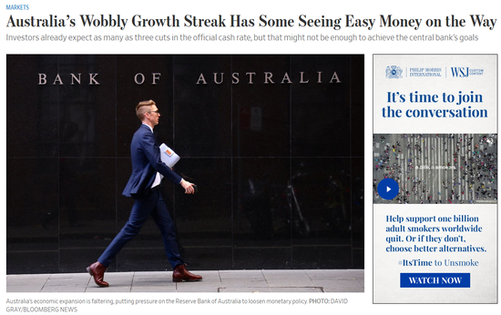澳大利亚拥有发达国家中持续时间最长的增长势头:得益于强劲的就业市场、充足的移民劳动力供应以及中国和其它国家对铁矿石等关键大宗商品的强劲需求,澳大利亚27年来从未出现过经济衰退。但现在该国经济扩张步履蹒跚,这给央行带来了放松货币政策的压力。