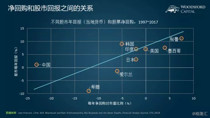在上面这张图中,我挑选了几个典型的股市案例。我们可以看到,在过去20年中,中国A股的股票净回购,是最低的,也就是意味着中国的上市公司圈了最多钱,因此她的回报(当地货币计)也是比较低的。比中国股市回报更低的股市,主要就是深受欧债危机影响的国家,比如希腊和爱尔兰。其中,希腊上市公司的圈钱规模也比较大,明显高于他们对于股民的反馈规模。