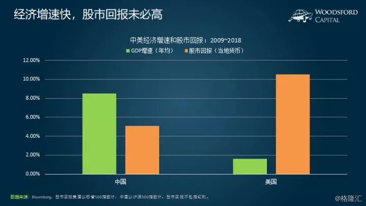 举例来说,2008年年底的沪深300指数和标普500指数,分别为1817点和931点。而2018年年底,沪深300指数和标普500指数的收盘价,分别为3010点和2531点。也就是说,在这10年间,以当地货币计算,不包括红利的话,美国股市的回报为每年10.5%左右,而中国股市的回报为每年5.1%左右,差不多仅是美国股市的一半。