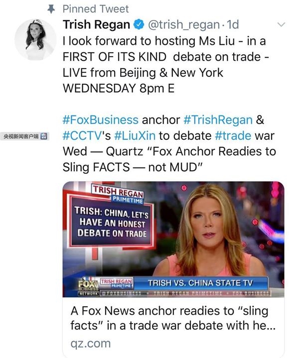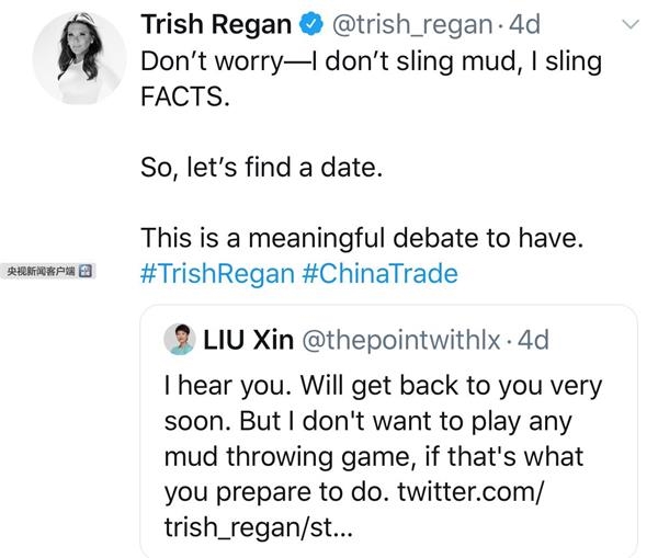 5月23日,Trish Regan在其节目中用11分钟对刘欣的评论作出回应,称“知道自己情绪激动,但也是在有证据的基础上”,并于同一日通过个人推特向刘欣“约辩”。刘欣“应约”。