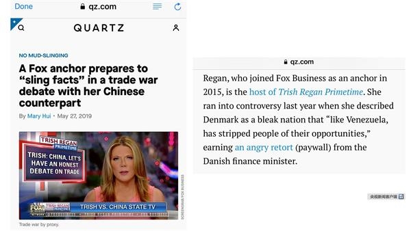 大西洋媒体(Atlantic Media)于2012年创立的数字商业新闻网站Quartz在报道中这样介绍Trish,“Trish Regan2015年以主播身份加入福克斯商业频道,成为《Trish Regan黄金时段》主持人。去年,Trish关于丹麦的一则报道引发争议。报道中Trish将丹麦描述成一个至暗国度,‘就像委内瑞拉一样,剥夺人民的机会’。丹麦财政部长随后愤怒又不失幽默地纠正了Trish的报道。”