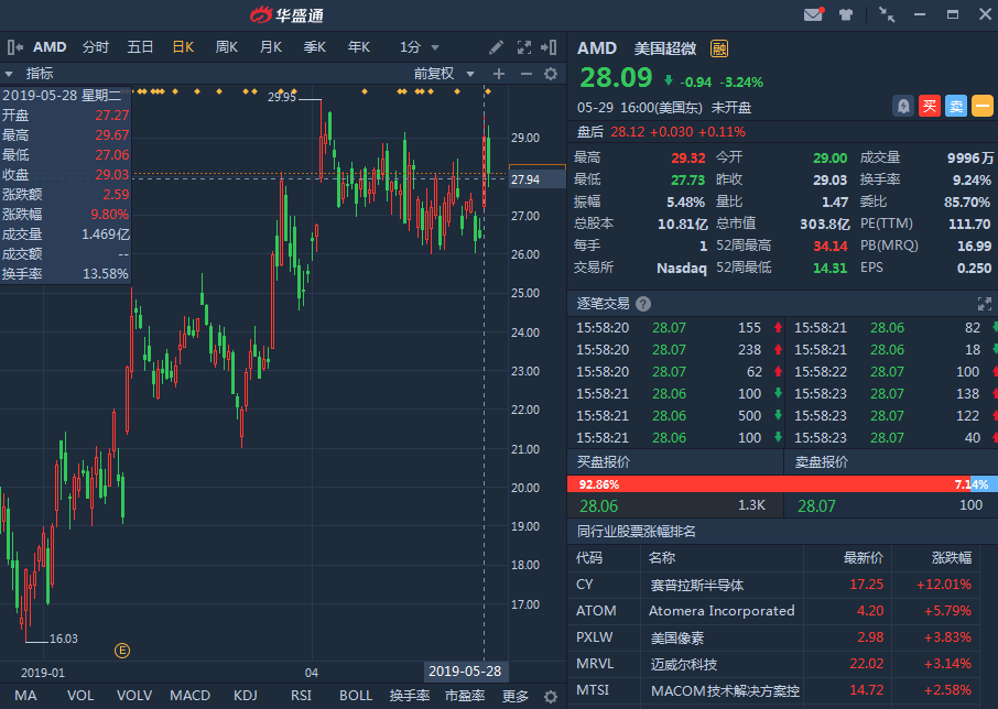 AMD在今年的台北电脑展上正式对外发布第三代锐龙Ryzen处理器,受消息提振,周二逆势大涨9.80%,盘中一度涨超12%,昨日大盘低迷的情况下收跌3.24%至28.09美元。