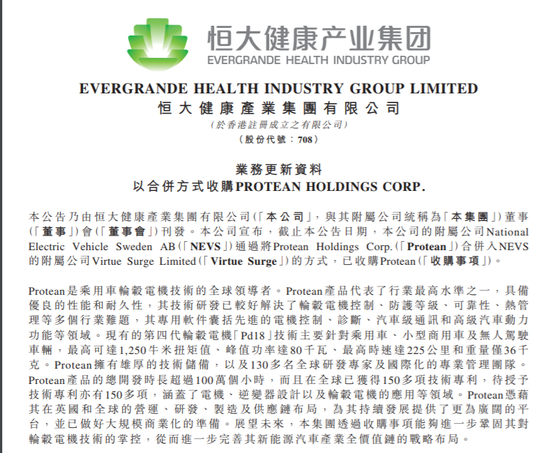 新浪财经讯 恒大健康发布公告,本公司的附属公司电动车瑞典AB(‘NEVS’)通过将Protean Holdings Corp.(‘Protean’)合并入NEVS的附属公司Virtue Surge Limited(‘Virtue Surge’)的方式,已收购Protean(‘收购事项’)的附属公司。