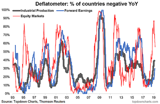 相比年前预测的逾80%国家股市将进入“通缩”状态(即价格同比缩水),Thomas目前认为,有更多的国家在工业产出和预期收益上,已进入了该“通缩”状态。不过,股市通缩指标已出现了剧烈下降,这意味着,或许通缩浪潮会像它迅速开始的那样迅速结束。
