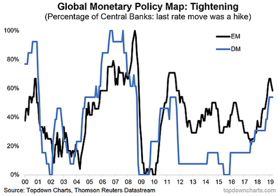 尽管不是特别明显,但下图仍明显地反映了全球货币政策的转向(至少是暂停了加息)。Thomas表示,年前的看法——央行正从市场稳定者转变为波动的来源,似乎只是暂时的。如果真是这样,对于市场周期而言,我们在未来数年可能将继续经历着“延期和假装(extent-and-pretend)”。