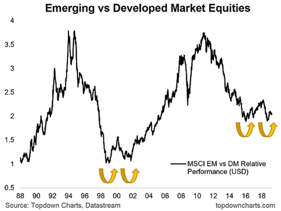 Thomas称,新兴市场相对发达市场在一季度的相对强劲表现,似乎是反映之前的判断错了。不过,目前言之过早,过程中出现波动和小的趋势反转也是正常现象。因而,Thomas认为目前还难下定论。接下来市场会发生什么,将取决于上一张图表中的指数相对美元走势的下跌幅度。