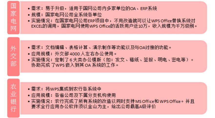 在世界500强中的 120 家中国企业,金山办公已服务 69 家,占比为 57.5%;国内 96 家央企中,服务客户达 82 家,占比为 85.4%;此外全国五大国有商业银行均为公司客户,12 家股份制银行中,服务客户达 11 家。以国家电网为例,公司 WPS Office 应用与国家电网全系统各单位,全单位使用 WPS 活跃用户万近 10 万,收入规模达千万级别。所以在近期外围局势变化下,央妈的转换也就不难理解了。