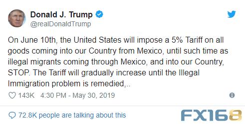 周四晚上,特朗普宣布,从6月10日起,美国将对所有墨西哥进口商品征收5%的关税,直到停止南部边境的非法移民。