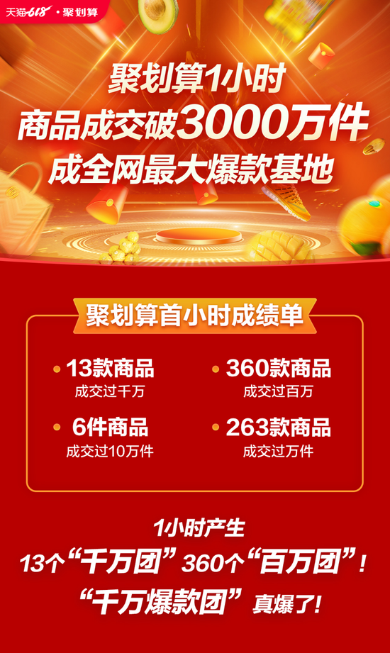 聚划算的全面加入,成为带动天猫618成交增长的关键引擎。今年3月,聚划算打通淘宝和天猫营销平台,成为整个大淘系最重要的营销工具,在天猫618中,聚划算推出的最大玩法“千万爆款团”,今天零点受到消费者热烈追捧,一小时内,13款商品成交过千万元,360款商品成交过百万元,而聚划算这一营销通道整体的商品成交,更超过3000万件。