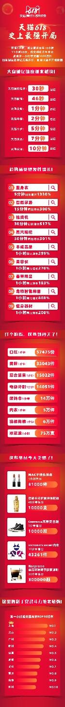 母婴行业也迎来开门红。开售2分钟内成交额破亿,第7分钟超过去年一小时成交额,第17分钟成交额突破5亿大关,第一个小时的成交额较去年同期增长了134%。另外,天猫国际母婴孕产品类,用了25分钟即完成去年同期全天的销售。