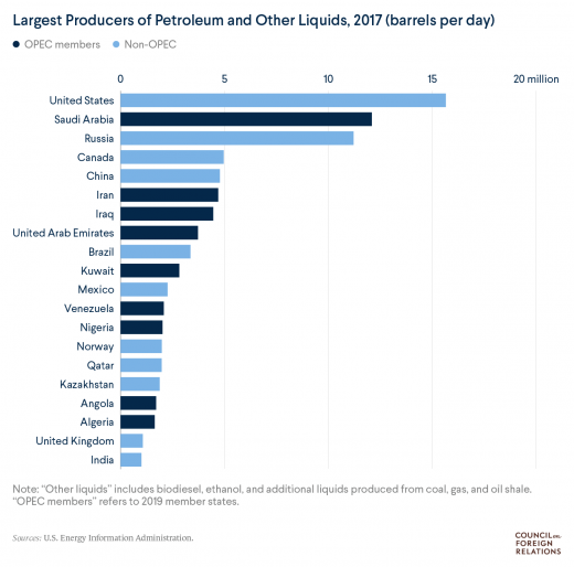 (2017年全球原油及其附属产品产量排名,来源:外交关系学会)