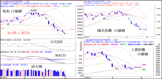 27410是24540至30280升幅的0.5倍回吐位,並已由支持轉化為阻力,恆指早前確切跌穿了這個支持之後,反彈也剛好受制於這個後抽阻力,結果造就了其後的跌勢,今早更抵達低一級的0.618倍回吐位26733。一般來說,首次跌至0.618倍回吐位,往往都會獲得良好支持,即使後市繼續向下,短線也有機會先出現反彈。