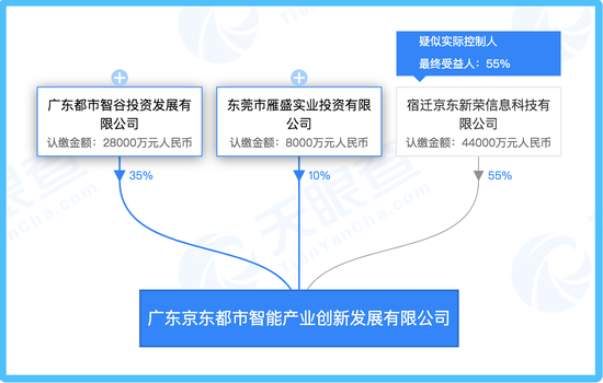 天眼查显示,广东京东由京东集团(55%)、都市智能集团(35%)、雁盛实业投资有限公司(10%)共同组建。