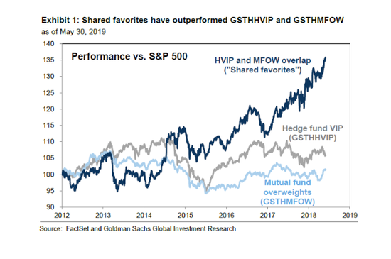 “战术上虽然有风险,不过公司所有权集中往往对后续的股票回报是利好,”策略师写道。“目前为止,成为两类投资者挚爱的股票(+18%),表现要优于被对冲基金VIP(+13%)或共同基金超配篮子(+15%)独宠的股票。”