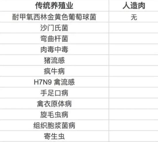 2015 年,红肉被世卫组织列为“第 2A 级致癌物”,即很有可能对人体致癌。食用其他蛋白质来源替代品则将降低患病风险,有利于身体健康。相信大家对 “禽流感”、“疯牛病” 这些词早就不陌生了。其实,肉蛋奶里含有的病毒可远远不止这几种,而人造肉就没有这个问题。下面这张表格是传统养殖业与人造肉在携带病菌方面的不同: