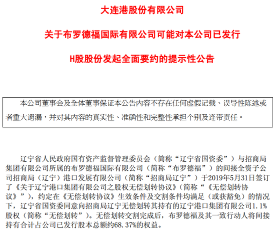 新浪港股讯 大连港早间公告,辽宁省国资委拟向招商局辽宁无偿划转其持有的辽宁港集1.1%股权,招商局辽宁为招商局集团所属的布罗德福的间接全资子公司。无偿划转交割完成后,布罗德福及其一致行动人将间接持有公司68.37%的权益。据相关规定,待完成交割后,布罗德福将进行可能H股要约,H股要约价为每股H股1.0127港元。