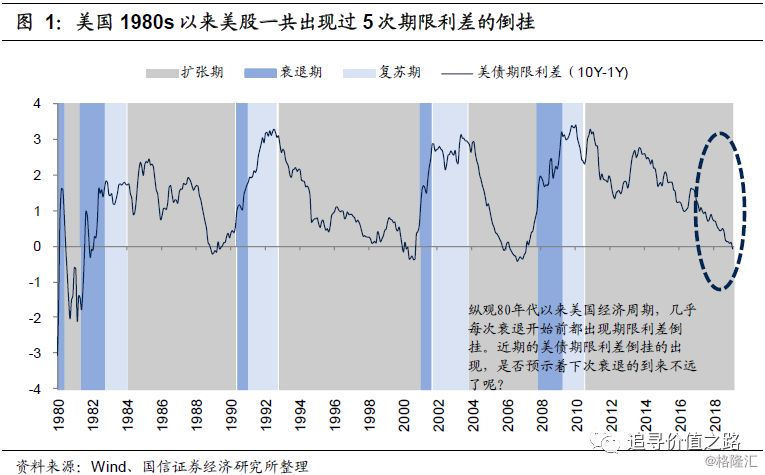 2017年以来美债期限利差逐渐缩窄,直至目前已经出现了10年期国债利率和1年期国债利率的倒挂。
