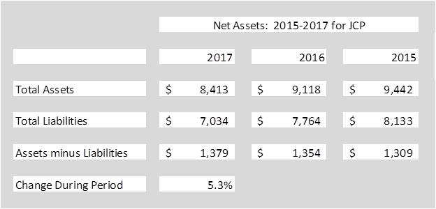 In the five years prior to their filing (found on Sears Holdings IR site in their 2017 Annual Report), Sears had run a negative EBITDA, so the ratio would not apply to their case. Sears had a sum of $3.4B of negative EBITDA in the five years prior to their filing and delivered a minus $526M in 2017, the year prior to their filing. This cumulative impact of earnings losses had eroded their assets to a large negative number (again, nearly $4B net asset hole) which is not similar to where JCP is today.