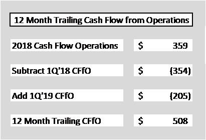 Again, we see that first quarter delivers consistently weak results. In order to determine how representative these results are to overall performance, one needs to evaluate the trailing 4Q cash flow from operations, found here: