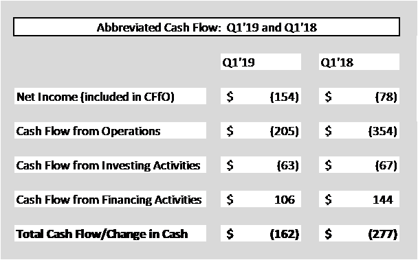 If you wanted to argue that a shortage of cash flow would prompt a bankruptcy filing, 2018 was the time to do it. Q1 cash flow from operations appears to be consistently negative, but 2018 looks substantially weaker than 2019. Comparing Q1 results to full-year results demonstrates, again, why one quarter annualizations (in retail) do not necessarily present a representative view.