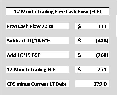 I have also taken the liberty to compare the free cash flow generated over the past four quarters with the upcoming debt payments (not interest, as they are already paid out of net income, subtracted prior to the cash flow statement) of $50M in October plus four quarterly payments of $10.55M, totalling $42M. This sums to the $92M that JCP reports as current debt due for 2019. After having paid for the debt redemptions claimed to be so troublesome, $179M in free cash will remain (AFTER the debt redemptions are complete). This would be enough to knock out the 2020 maturity as well.