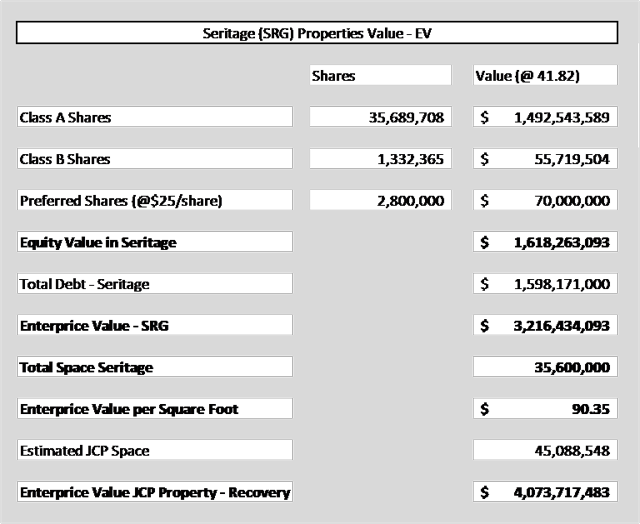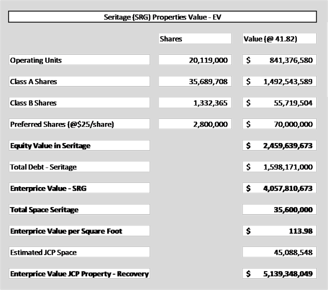 That would be to use the market value for Seritage, representing a portfolio of "big boxes" like those owned by JCP having a distribution across the country similar to JCP, and calculate an enterprise value per square foot to use as a reasonable (unemotional) estimate for the recovery value for JCP real estate.