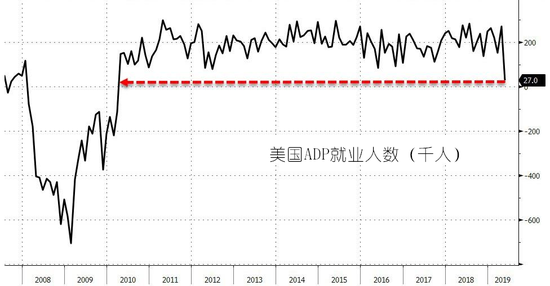 周三(6月5日)20:15公布的美国5月ADP就业数据录得增加2.7万人,创2010年3月来最差表现,远低预期的增加18万人,前值为增加27.5万人。