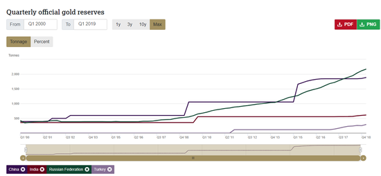 在2019年一季度,包括中国、俄罗斯、印度、土耳其等新兴市场经济体的央行黄金储备均出现明显上升。