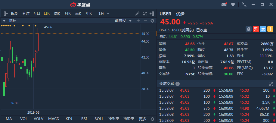 受券商评级影响,Uber周三大涨5.26%,报收45美元,是上市以来首次站上45美元的发行价。