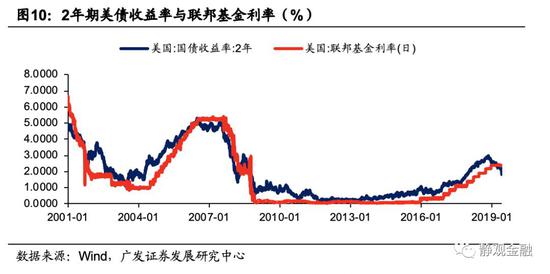 此外,2年期美债收益率基本围绕基准利率波动。截止2019年6月4日,2年期美债收益率为1.88%,低于基准利率(2.25-2.5%)下限37BP,相当于两次降息的结果。