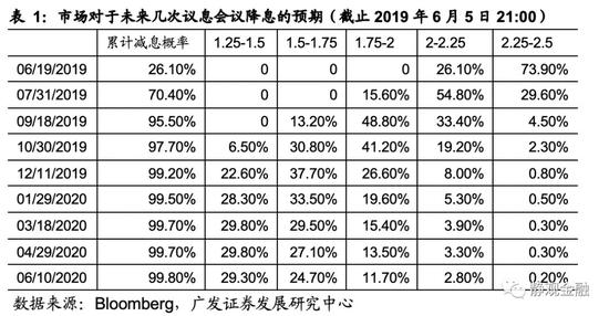 从两个指标看,市场已经反映了美联储2-3次降息预期。一来,表1所示市场预计2019年12月议息会议降息累计概率是99.2%,但是预计届时基准利率落在2-2.25%区间的概率仅为8%,落在1.75-2%区间和1.5-1.75%区间的概率分别为26.6%及37.7%,甚至落在1.25-1.5%区间的概率也有22.6%。这表明截止2019年6月5日21:00市场对未来一段时间降息2-3次的预期比较强烈。
