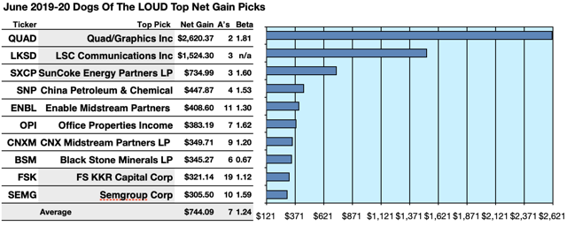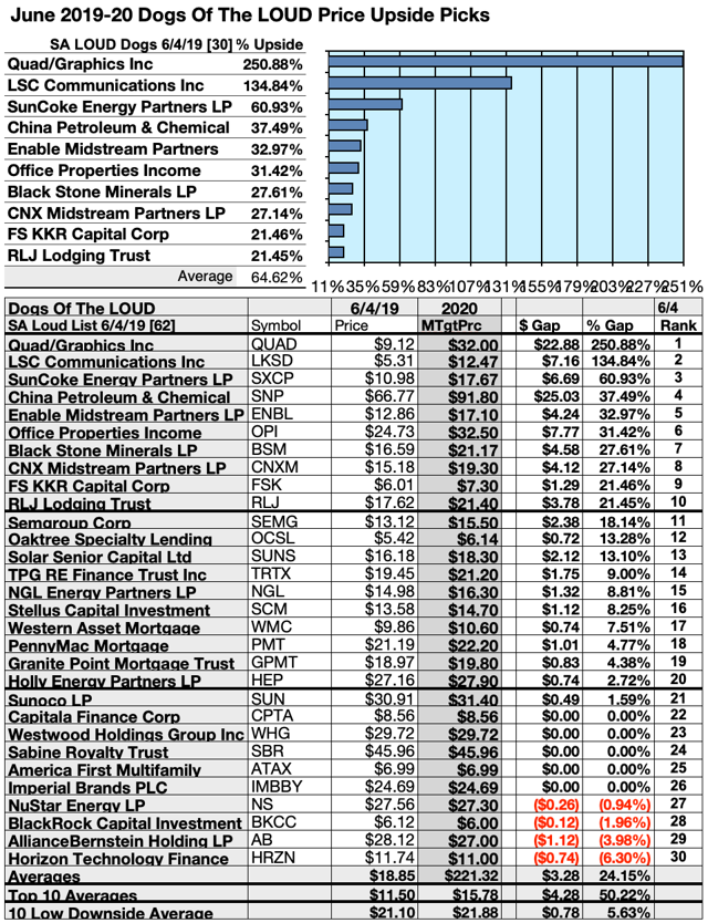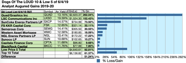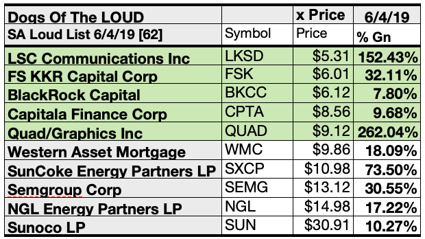 Top 10 broker target-estimated Dogs crying out LOUD by net gains as of 6/4/19 ranged 30.55%-262.04% from SEMG, FSK, BSM, CNXM, OPI, ENBL, SNP, SXCP, BGCP, and top dog QUAD.