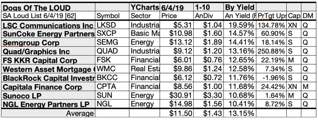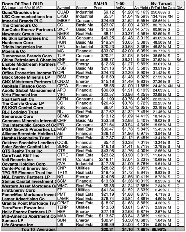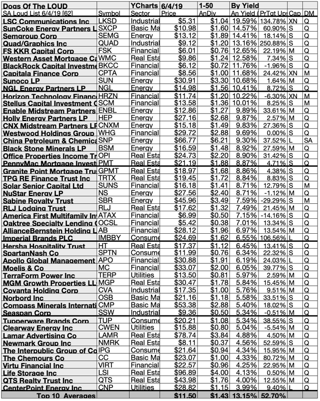 62 dividend-paying Dogs crying out LOUD ranged in estimated yield from 3.01% to 19.59%. Top 10 - NGL, SUN, CPTA, BKCC, WMC, FSK, QUAD, SEMG, SXCP, and LKSD - averaged 13.15%.