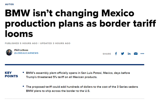 如果特朗普兑现了对所有来自墨西哥的商品征收5%税的威胁,会发生什么?宝马可能会像多年来一样,继续从德国向美国出口宝马3系轿车。不过,如果特朗普兑现他曾多次发出的另一个贸易威胁,提高欧洲制造并运往美国的汽车的关税,这可能依旧无济于事。