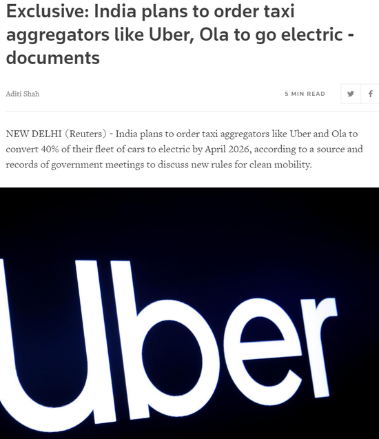 据一名消息人士和政府会议记录显示,印度计划在2026年4月之前,命令优步和Ola等出租车聚合商将40%的出租车转为电动汽车。