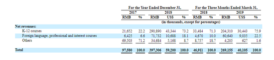 而在其各项业务中,覆盖小初高语数外、物理、化学、生物等全学科的K12课程,以及适合大学生、职场人士等成人阶段的语言、职业资格及生活兴趣类课程,成为了营收主要来源。其中,K12课程的营收占比已从2017年的22.2%上升至2018年的73.2%,且还有持续上升态势;职业资格及生活兴趣类课程的营收占比近两年也在稳步提升。