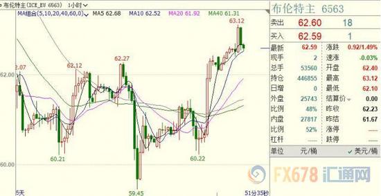 汇通财经易汇通软件显示,北京时间17:00,NYMEX原油期货上涨1.46%至53.36美元/桶;ICE布伦特原油期货上涨1.62%至62.67美元/桶。