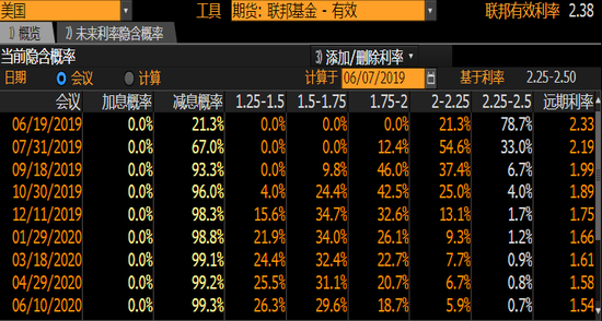 ① 5月非农数据公布后,联邦基金利率期货暗示市场预计美联储2019年年内降息概率为98.3%,加息概率为0%;