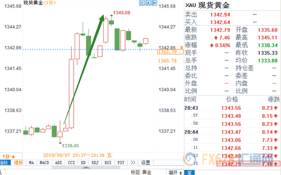 北京时间周五(6月7日)20:30,美国劳工部公布5月非农就业报告,表现令市场大跌眼镜,进一步强化了美联储年内加息预期。截至发稿,美指跳水逾45点至96.581,现货黄金飙升7.6美元至1345.08美元/盎司。