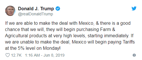 特朗普在推特上写道:“如果我们能够与墨西哥达成协议,而且我们很有可能会达成协议,他们将立即开始以非常高的水平购买农产品。如果我们不能达成协议,墨西哥将在周一开始支付5%的关税!”