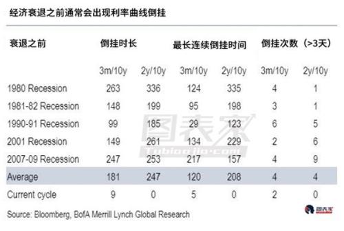 此外,美国银行回顾历史数据发现,在过去5次经济衰退之前,通常会有一次持续较久的倒挂和多次称之为倒挂的情况(利率曲线倒挂时长大于3天)。