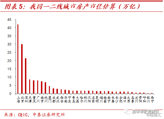 1、居民财富:六成押注地产。我国居民部门直接配置的房产占总资产的比例高达46%,考虑到2016年之后的这一波房地产繁荣,截至2018年底我国居民持有房产的总市值至少在200万亿以上。如果考虑到居民间接配置的与房地产相关的资产,我国居民六成资产配置在了房地产及相关的领域。