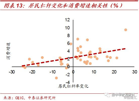 3、买房变穷了?没买房的更穷。从全球主要经济体的数据来看,我们发现居民加杠杆抑制消费的现象并不明显,反而是加杠杆的速度和消费增速显著正相关,而且房地产相关消费增速和其他非必需消费增速是同涨同跌的,并没有表现出房地产相关消费多了就抑制其它消费的现象。所以2018年以来我国消费增速的下行,主要原因不是加杠杆加太多,而是因为加杠杆加太慢、房价不怎么涨了。