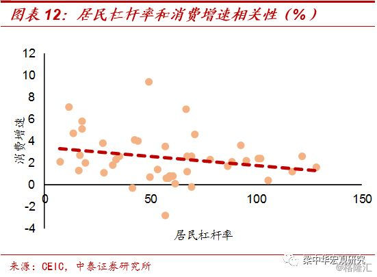 其实背后的道理很容易理解,即使居民债务负担已经很重,消费会受到一定影响,但如果这个时候居民仍在继续大规模借债,消费还是有资金支持的,短期仍有可能维持高增长。更何况居民借债主要购买的是房产资产,房价上涨的收入效应和财富效应,会对消费有拉动作用。所以居民杠杆率高问题不大,只要居民还在继续加杠杆、房价还在上涨,消费还是会不错;而更应该令人担心的恐怕是居民杠杆高、而居民还在去杠杆、房价在下跌的经济体,消费就会更低。