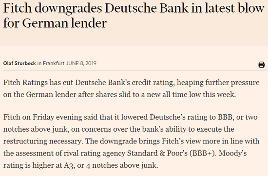 惠誉周五晚间表示,由于担心德意志银行执行必要重组的能力,它将其评级下调至BBB,比垃圾级高出两个级距。此次评级下调使惠誉的观点与标准普尔的评估(BBB+)更加一致。穆迪对德银的评级为A3,比垃圾级高4级。