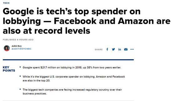 随着美国科技巨头面临着来自监管机构越来越多的有关隐私做法和市场控制的审查,它们正花费更多的钱试图影响议员。根据Center for Responsive Politics的数据,谷歌去年在游说上花费了2170万美元,连续两年超过波音和AT&T等传统领先者,成为支出最多的公司。另外,亚马逊和Facebook在2018年的游说支出也达到了创纪录的水平。